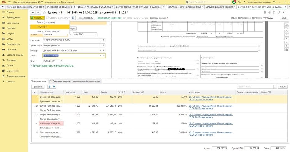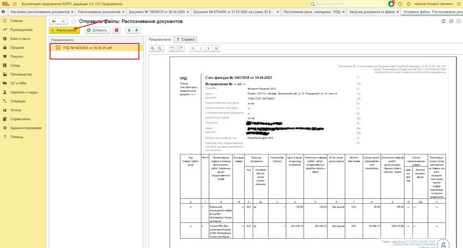 После помещения документа на форму нужно кликнуть на кнопку Распознать, и через некоторое время после окончания обработки документа можно его открыть, кликнув по строке, и настроить сопоставление номенклатуры (рис. 6).