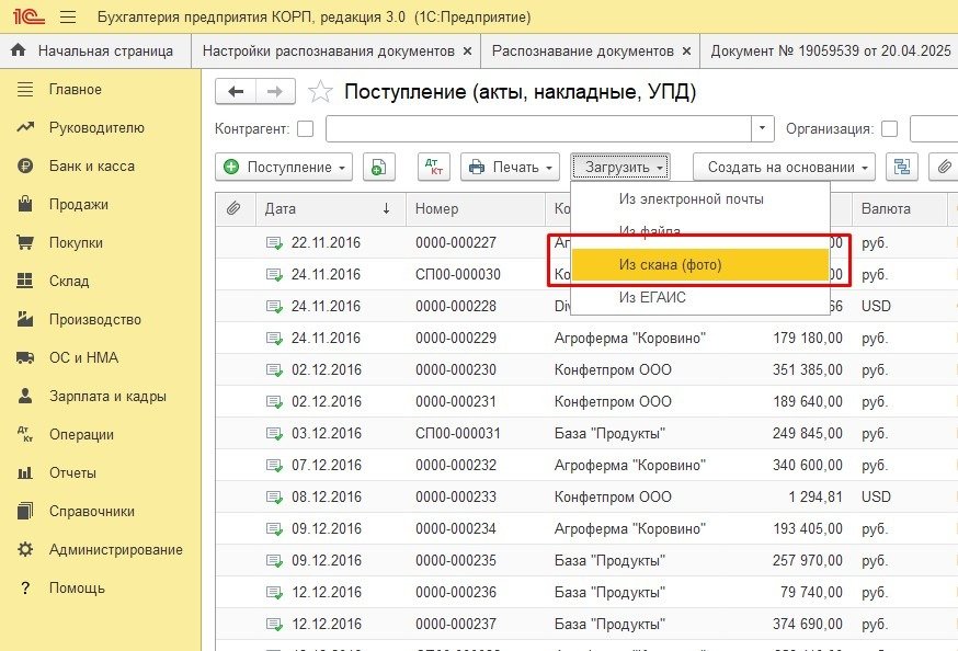 После этого можно загружать документ в формате pdf в программу. Например, из формы списка журнала документов Поступление (акты, накладные, УПД), кликнуть по кнопке Загрузить и выбрать пункт Из скана (фото), рис. 4.