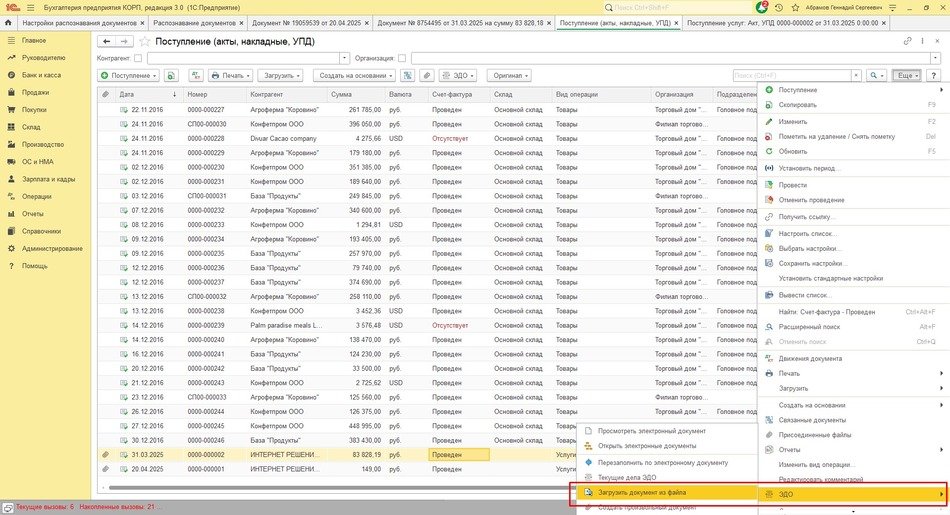 Обратите внимание! Для загрузки в «1С:Бухгалтерию 8» файлов в формате xml можно использовать 1С-ЭДО, даже если он не подключен. Для этого нужно в форме списка журнала документов Поступление (акты, накладные, УПД) в меню Еще выбрать пункт ЭДО, а затем Загрузить из файла (см. рис. 1), после чего выбрать полученный xml-файл.