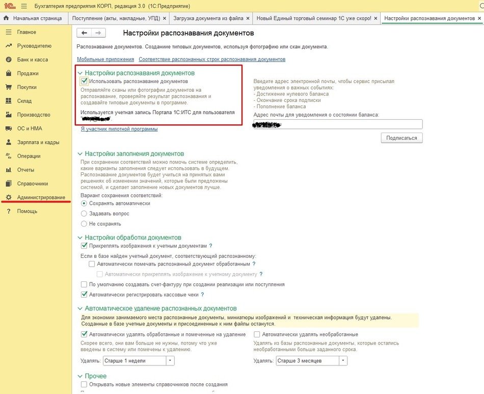 Обратите внимание! Для использования возможностей сервиса 1С:Распознавание первичных документов необходимо иметь учетную запись на портале 1С:ИТС и выполнить вход с ее помощью.