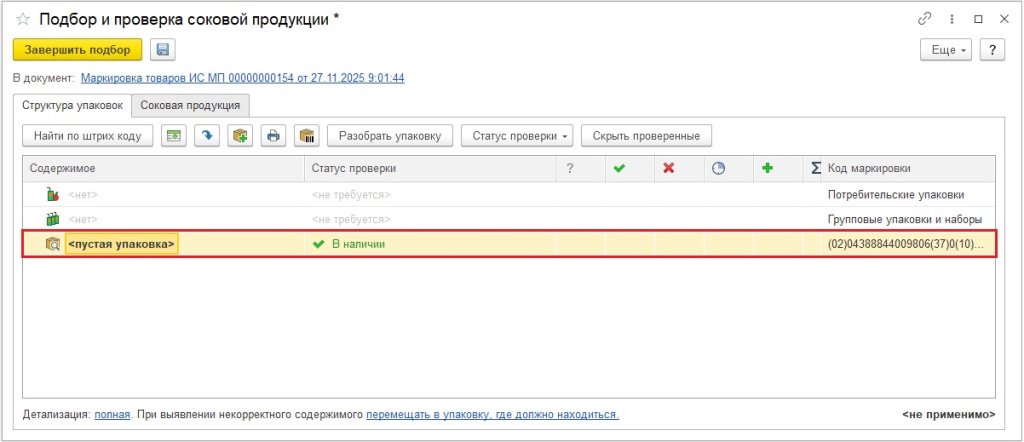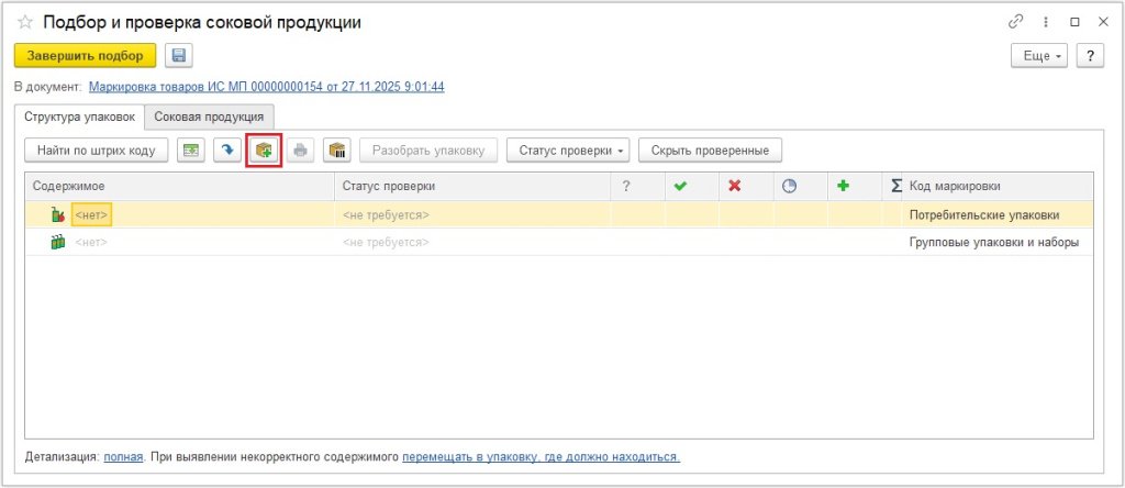 Рис. 18. Добавление упаковки в документе «Маркировка товаров ИС МП»