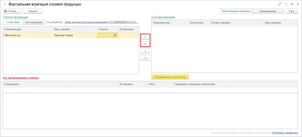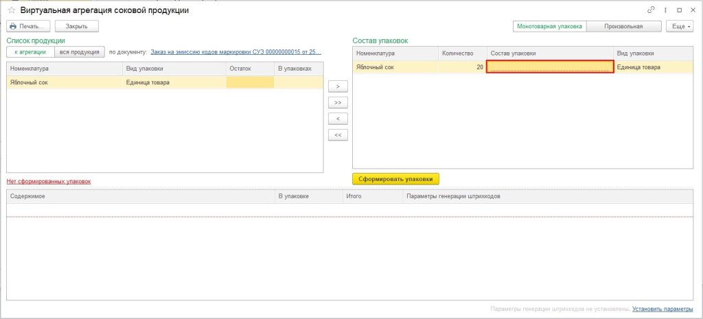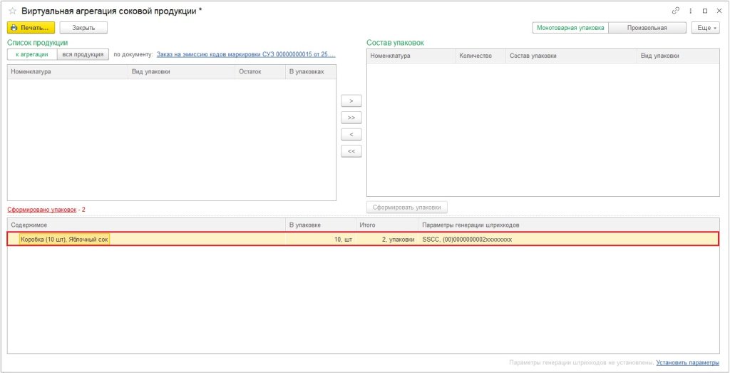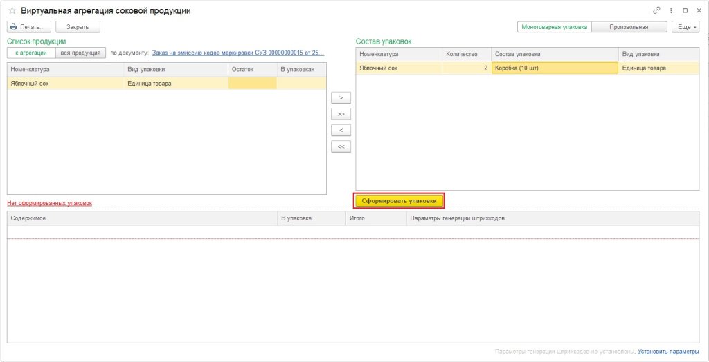 На форме виртуальной агрегации нажмите кнопку Сформировать упаковки.