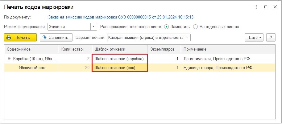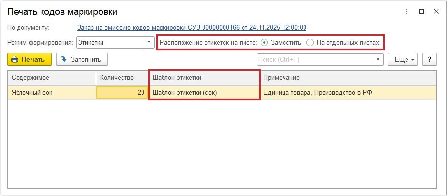 Перед печатью выводится предупреждение, что коды можно напечатать только один раз. Это требование законодательства. Физически коды маркировки могут наноситься следующим образом: