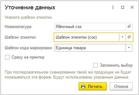 Рис. 21. Уточнение данных для печати этикетки