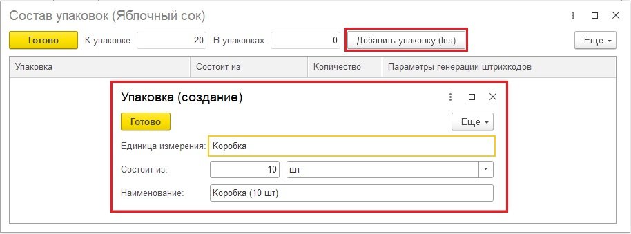 На форме Состав упаковок нажмите кнопку Добавить упаковку. Укажите, сколько единиц продукции входит в упаковку.