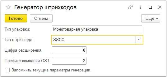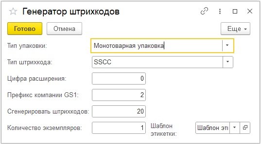 Укажите количество упаковок и параметры генерации штрихкодов.