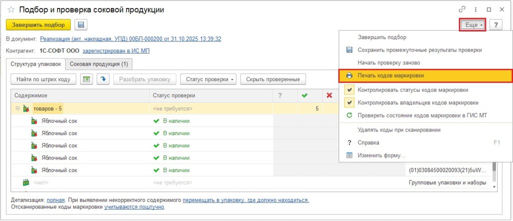 Печать дубликатов отгружаемых кодов для передачи контрагенту, например, для нанесения им кодов на собственную упаковку товара. Для этого в документе Реализация товаров (накладная, УПД) в форме подбора и проверки маркируемой продукции нажмите на кнопку Еще – Печать кодов маркировки.
