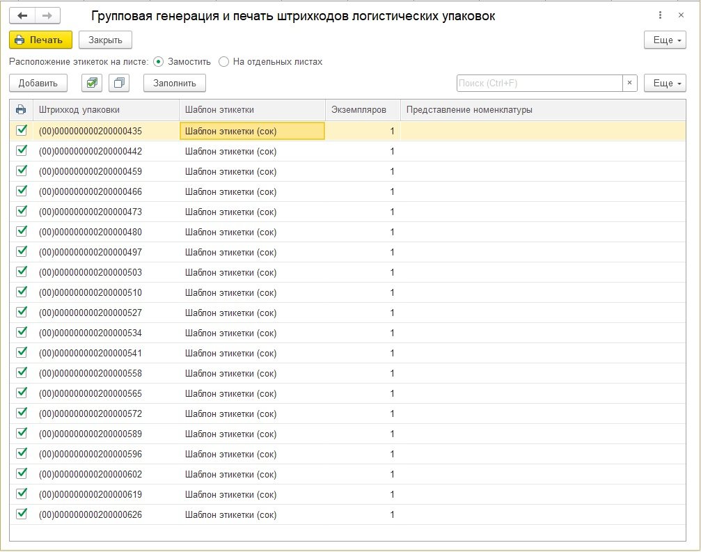 Рис. 22. Печать дубликатов кодов маркировки