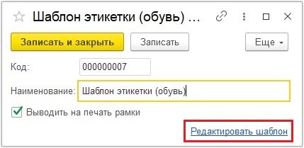 Перед печатью кодов маркировки можно настроить шаблон этикетки. В программе предусмотрен готовый шаблон этикетки для маркированных товаров – Шаблон этикетки (обувь). Шаблон находится в разделе Справочники – Номенклатура – Шаблоны ценников и этикеток.