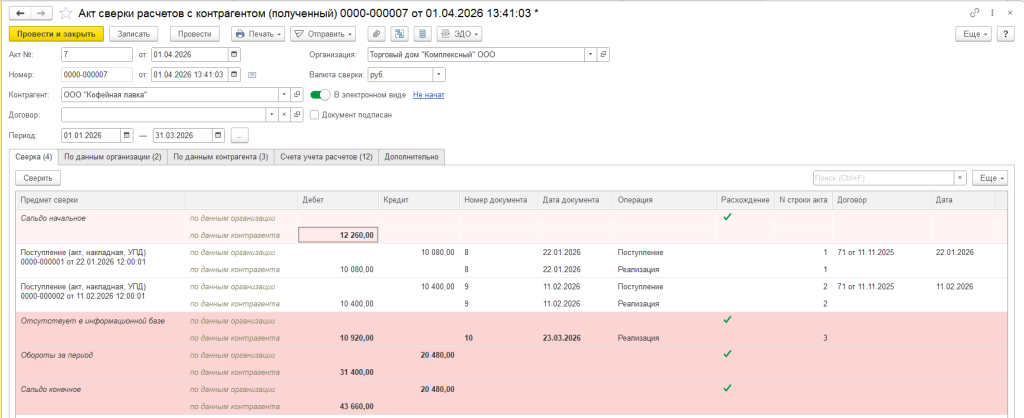 Если в процессе обсуждения вы вносите правки и отправляете ссылку повторно, то в базе получателя будет создан новый документ Акт сверки (полученный). Это гарантирует чистоту учета: система не затирает данные задним числом, а позволяет видеть историю согласования и точно фиксировать каждую итерацию правок.