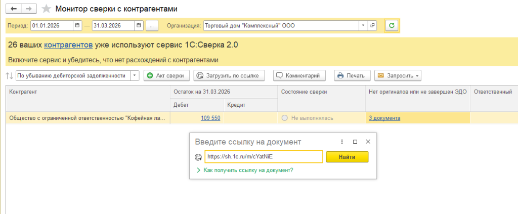Контрагент на своей стороне в разделе Покупки – Монитор сверки нажимает кнопку Загрузить по ссылке. Также полученную ссылку можно просто вставить в поле глобального поиска программы – 1С сама распознает документ и предложит загрузить его в базу.