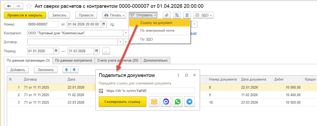 Прямо из монитора можно в один клик создать акт. После того, как документ проведен, нажмите кнопку Отправить – Ссылку на документ.