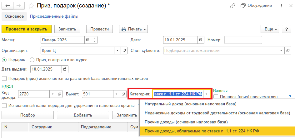 Рис. 3. Категория дохода в документе «Приз, подарок» в программе «1С:Зарплата и управление персоналом 8» ред. 3