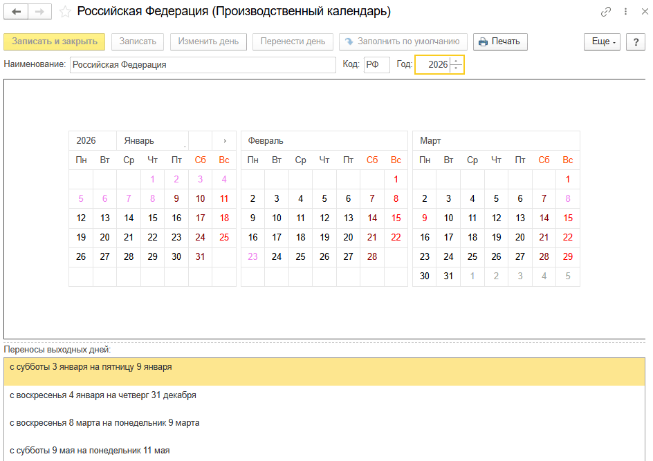 Рис. 3. Производственный календарь на 2026 год в программе «1С:Зарплата и управление персоналом 8» ред. 3