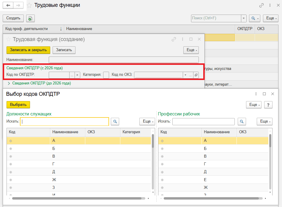 После обновления программа выявит явные соответствия по Наименованию и Коду по ОКЗ между старой и новой версиями классификатора и автоматически заполнит найденный код ОКПДТР в одноименном поле. Коды следует проверить и при необходимости указать вручную. Действие прежнего классификатора ОКПДТР уточнено в наименовании в скобках (до 2026 года).