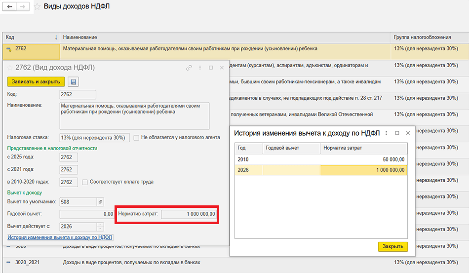 Начиная с версий 3.1.34.107 и 3.1.35.47 в программе «1С:Зарплата и управление персоналом 8» ред. 3 для вида дохода НДФЛ с кодом 2762 «Материальная помощь, оказываемая работодателями своим работникам при рождении (усыновлении) ребенка» (раздел Налоги и взносы – См. также) увеличен размер вычета к доходу с 2026 года (рис. 1). Норматив затрат в размере 1 млн руб. также добавлен в регистр сведений Скидки к доходам при исчислении страховых взносов.
