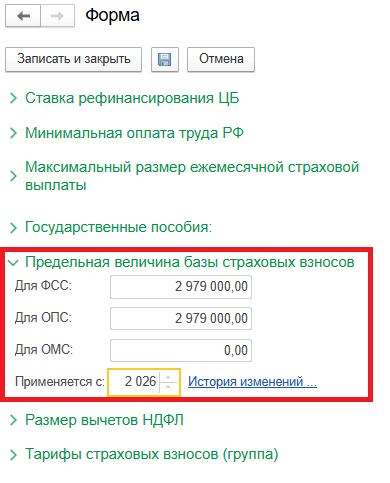 Рис. 2. Предельная величина базы страховых взносов в программе «1С:Зарплата и управление персоналом 8» ред. 3