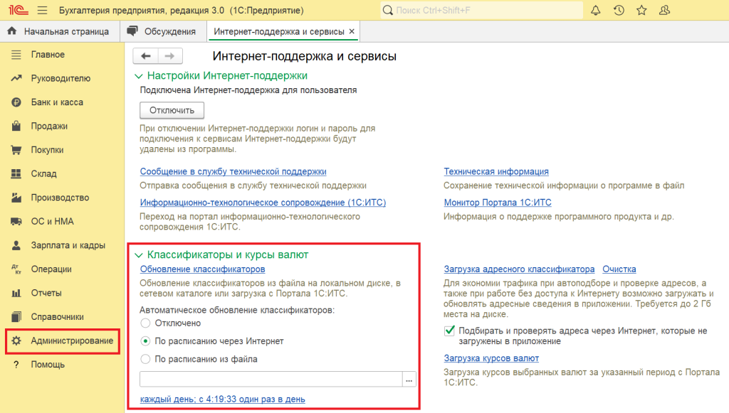 Например, в программе «1С:Зарплата и управление персоналом 8» ред. 3 загрузить обновление через интернет можно по ссылке Обновление классификаторов (раздел Администрирование – Интернет-поддержка и сервисы — Классификаторы и курсы валют).