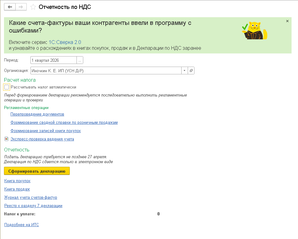 Для корректного расчета НДС, отражения его в учете и автоматического формирования декларации (в том числе и при УСН) в программе предусмотрен специализированный помощник по НДС (раздел Отчеты – Отчетность по НДС). Помощник подскажет, какие учетные процедуры и какие регламентные операции НДС требуется выполнить по итогам налогового периода (рис. 1).
