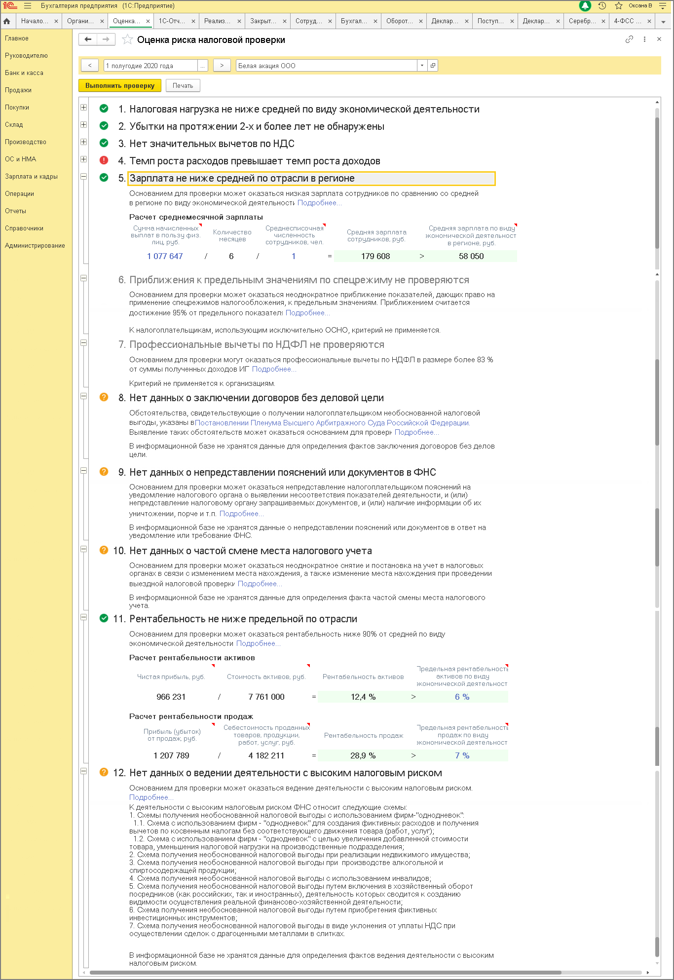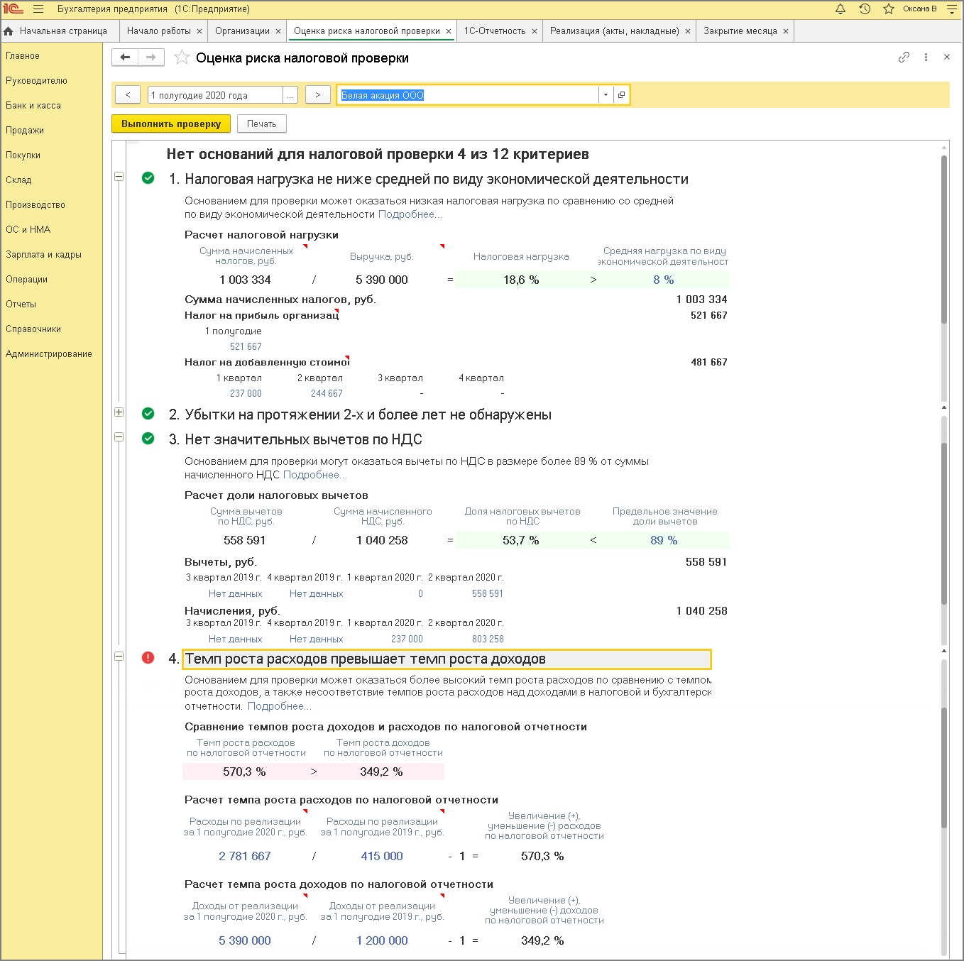 - Раздел: Отчеты - Оценка риска налоговой проверки.