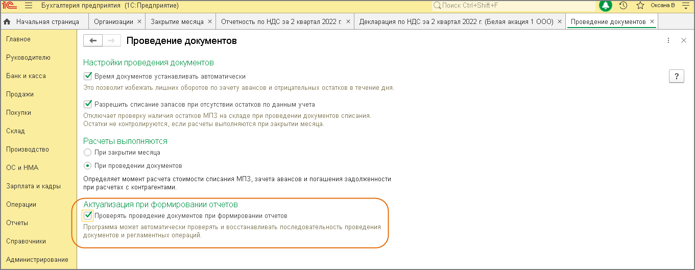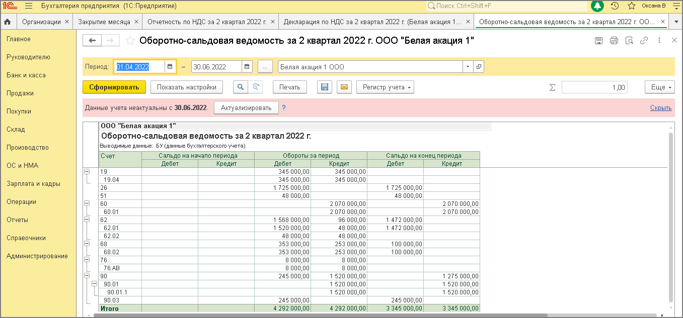 - при формировании отчетов, в которых важно и соблюдение хронологической последовательности документов, и выполнение регламентных операций, в том числе по НДС (например, ОСВ, экспресс-проверка и другие), по кнопке Актуализировать сначала выполняется закрытие месяца, затем проверяется актуальность расчета НДС, и если данные учета НДС неактуальны, то предлагается выполнить расчет НДС.