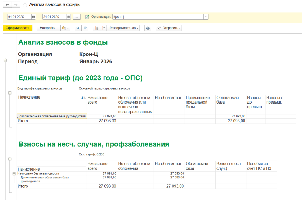 В отчете Анализ взносов в фонды отдельной строкой показана Дополнительная облагаемая база руководителя, зарегистрированная по документу Регистрация облагаемой базы руководителя (раздел Налоги и взносы), которая дополняет недостающую сумму облагаемой базы до МРОТ (федеральный), рис. 2.