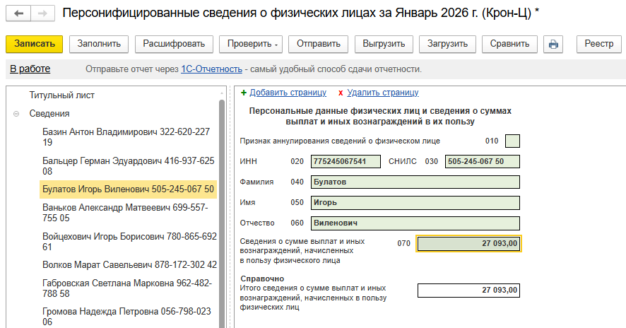 В программе «1С:Зарплата и управление персоналом 8» ред. 3 в регламентированных отчетах отражается вся сумма МРОТ 27 093 руб., начиная с отчетности за январь 2026 года (рис. 1).