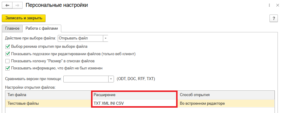Внутри новых документов на панель формы вынесена команда Открыть файл. Для открытия файла во встроенном редакторе в программе необходимо предварительно добавить расширение «csv» (вписать вручную в одноименное поле без скобок) в персональных настройках (раздел Настройка – Сервис – Персональные настройки – Работа с файлами – таблица Настройки открытия файлов – Расширение), рис. 1.