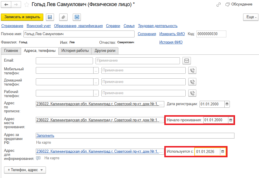 Также в личные данные работников (раздел Кадры – Сотрудники или Физические лица) добавлены новые поля для ввода даты начала проживания для адреса места проживания и даты Используется с для адреса для информирования (рис. 3). При заполнении Карточки гражданина, подлежащего воинскому учету (раздел Кадры – Кадровые отчеты – Отчетность для военкоматов) в разделе «I. Общие сведения» в п. 11 отображается только дата начала проживания.