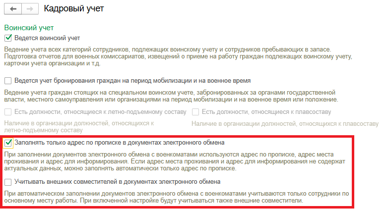 Для автоматического заполнения в документах и отчетах воинского учета только адреса по прописке без адреса места пребывания и фактического адреса в настройках кадрового учета (раздел Настройка – Кадровый учет – Воинский учет) добавлена возможность установки нового флага Заполнять только адрес по прописке в документах электронного обмена (рис. 2).