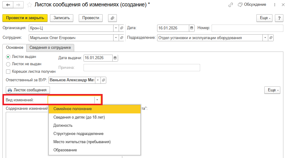 Рис. 4. Новое поле «Вид изменений» в документе «Листок сообщения об изменениях» в программе «1С:Зарплата и управление персоналом 8» ред. 3