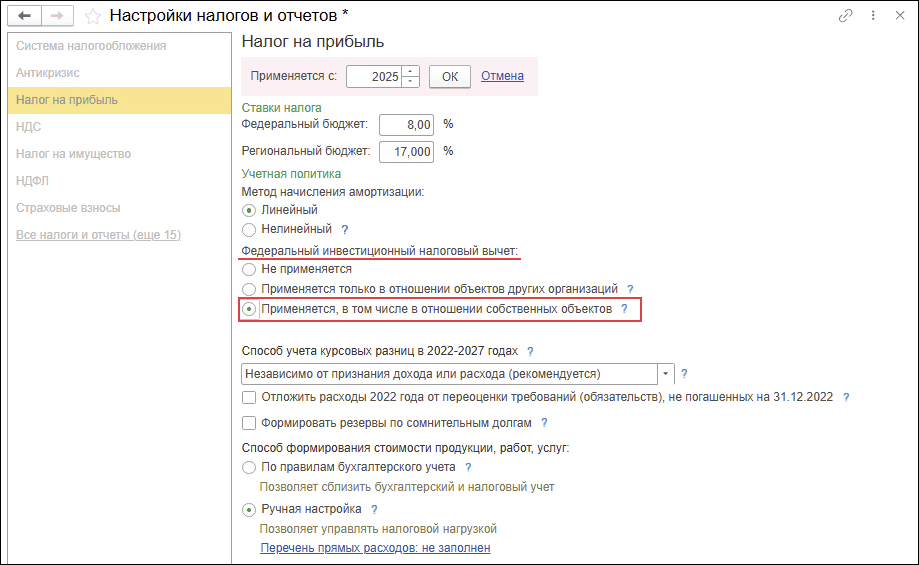 Как в «1С:Бухгалтерии 8» применять федеральный инвестиционный налоговый вычет по налогу на прибыль