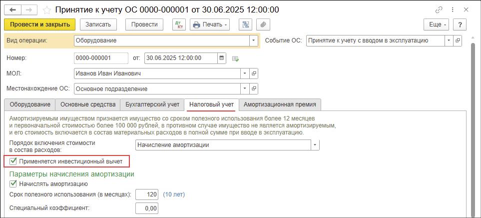 - в поле Оборудование следует выбрать из справочника Номенклатура объект, который вводится в эксплуатацию;