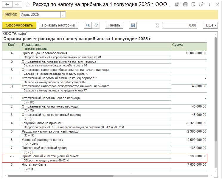 В «1С:Бухгалтерии 8» начиная с версии 3.0.181 поддерживается применение федерального инвестиционного налогового вычета по налогу на прибыль. В плане счетов для учета ФИНВ предусмотрены счет 99.02.И «Инвестиционный вычет по налогу на прибыль» и счет ИНВ.Ф «Федеральный инвестиционный налоговый вычет».