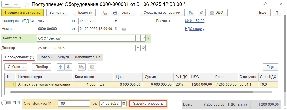 Затраты на приобретение ОС и учет входного НДС (операции 2.1 и 2.2) отражаются с помощью документа Поступление (акт, накладная) с видом операции Оборудование) (рис. 2), раздел Покупки – Поступление (акты, накладные, УПД) или раздел ОС и НМА – Поступление оборудования, кнопка Создать. Далее нужно заполнить основную часть документа (см. рис. 2).