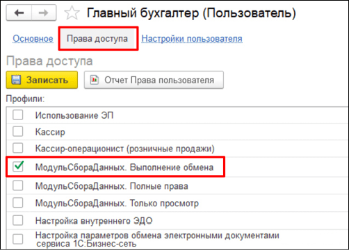 В форме настройки пользователя следует перейти в раздел Права доступа и установить флаг у профиля МодульСбораДанных. Выполнение обмена (рис. 3).