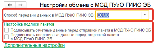 В поле Способ передачи данных в МСД ПУиО ГИИС ЭБ следует выбрать «ЕСМВ» (рис. 1). В случае, если требуется подписывать выгружаемые пакеты отчетных или оперативных данных электронной подписью, необходимо установить соответствующие флаги в разделе Настройка подписи пакетов.