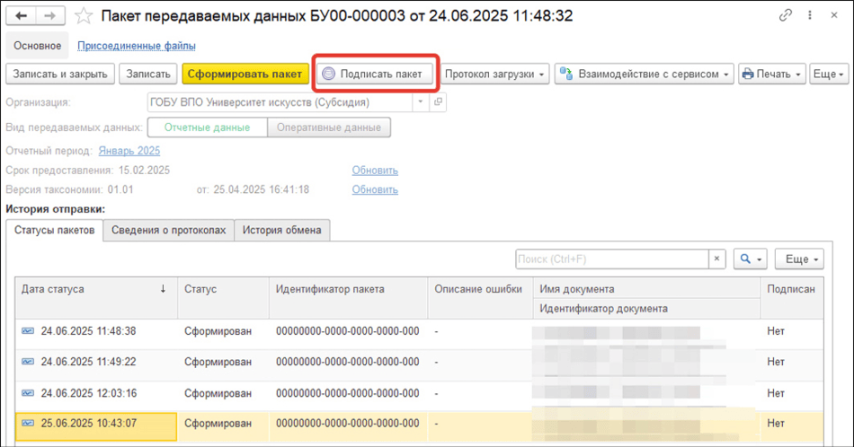 После подписания пакета будет выполнена автоматическая отправка пакета данных в МСД.