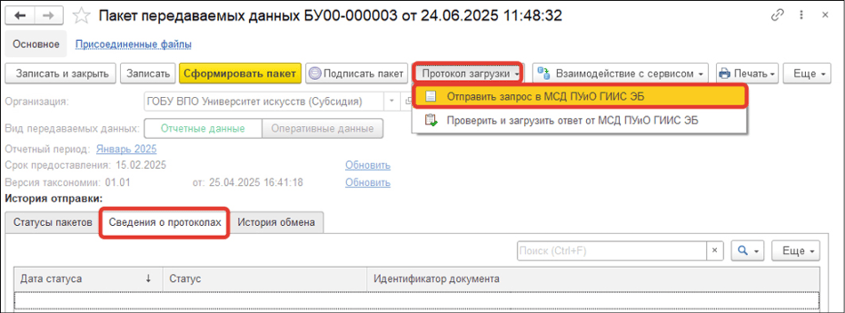 - в файловой базе данных, его нужно будет получить вручную, нажав кнопку Протокол загрузки – Отправить запрос в МСД ПУиО ГИИС ЭБ.
