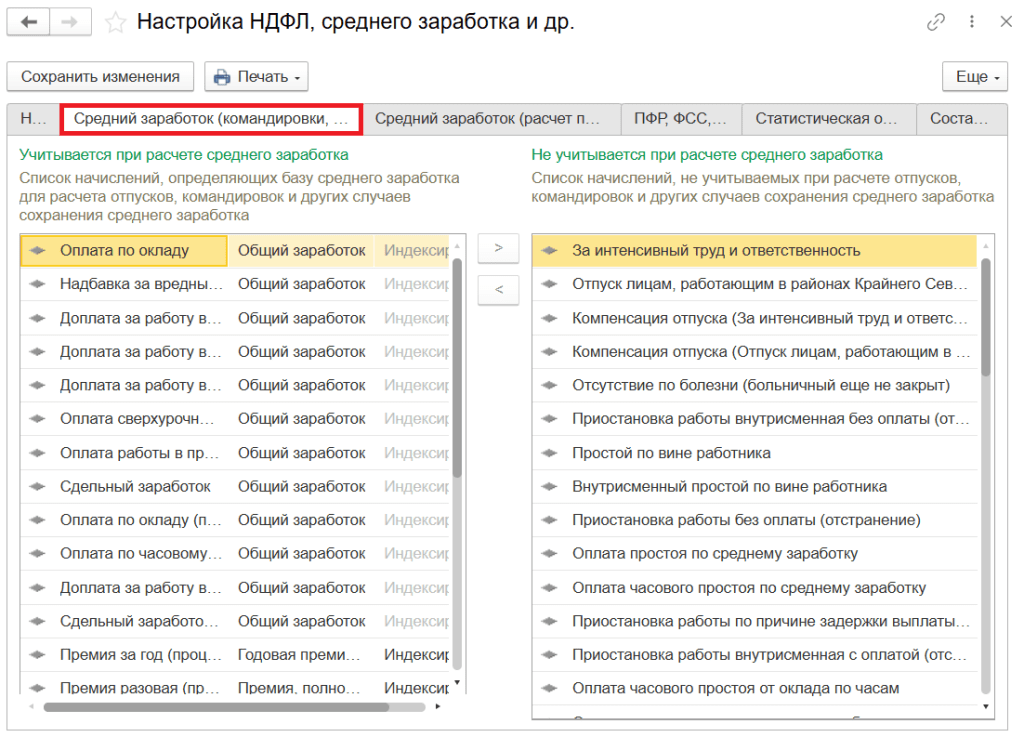 В новом окне Настройка НДФЛ, среднего заработка и др. на вкладке Средний заработок (командировки, отпуска и др.) можно посмотреть и изменить базы среднего заработка для расчета отпусков, командировок и других случаев сохранения среднего заработка.