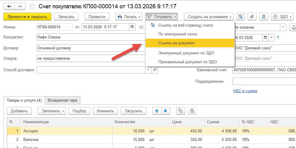 Функция получения ссылки доступна прямо из формы документа или списка документов (например, Счета на оплату). В некоторых интерфейсах кнопка может называться Поделиться документом и располагаться прямо на главной панели.