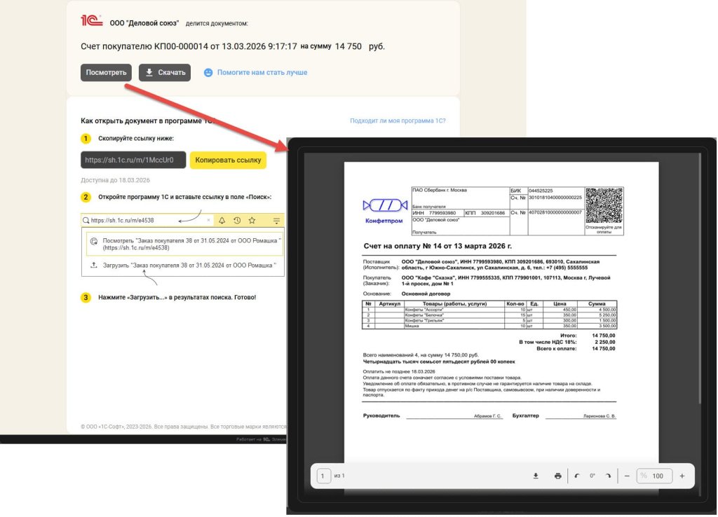 При этом ваш партнер может загрузить документ в свою базу 1C буквально одним кликом. При этом сервис позволяет делиться документами даже с теми контрагентами, кто не пользуется 1С. Если у контрагента нет программы 1С, он может ознакомиться с полученным документом в браузере на компьютере или мобильном телефоне.