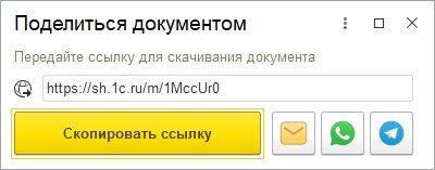 Нажмите кнопку Отправить (иконка конверта) и выберите пункт Ссылку на документ. Программа автоматически подготовит данные для передачи в защищенное облако 1С и сформирует уникальную ссылку.