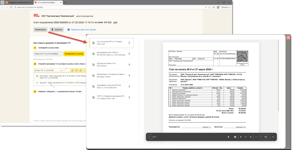 Вашему партнеру даже не обязательно открывать 1С, чтобы увидеть ваши документы. Он просто нажимает на ссылку в сообщении и попадает на страницу в интернете, где сразу видит и счет, и все дополнительные файлы, которые вы приложили.