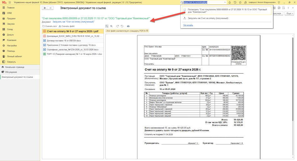 Если ваш контрагент тоже работает в 1С, процесс получения документов становится максимально простым. Ему не нужно скачивать файлы на компьютер или искать их в папках – достаточно скопировать полученную ссылку и вставить ее в строку поиска программы 1С. Программа мгновенно узнает ссылку 1С:Share и откроет окно предпросмотра. Прямо здесь, еще до того как документ попадет в учет, бухгалтер может спокойно рассмотреть сам счет или акт и проверить все прикрепленные вложения (сканы, реестры, таблицы).