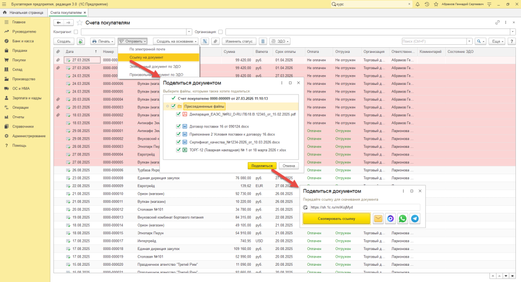 Сервис 1С:Share меняет этот процесс. Теперь отправить счет или акт вместе со всеми приложениями можно напрямую из программы 1С. Вы просто передаете ссылку контрагенту через мессенджер (например, MAX) или по электронной почте.