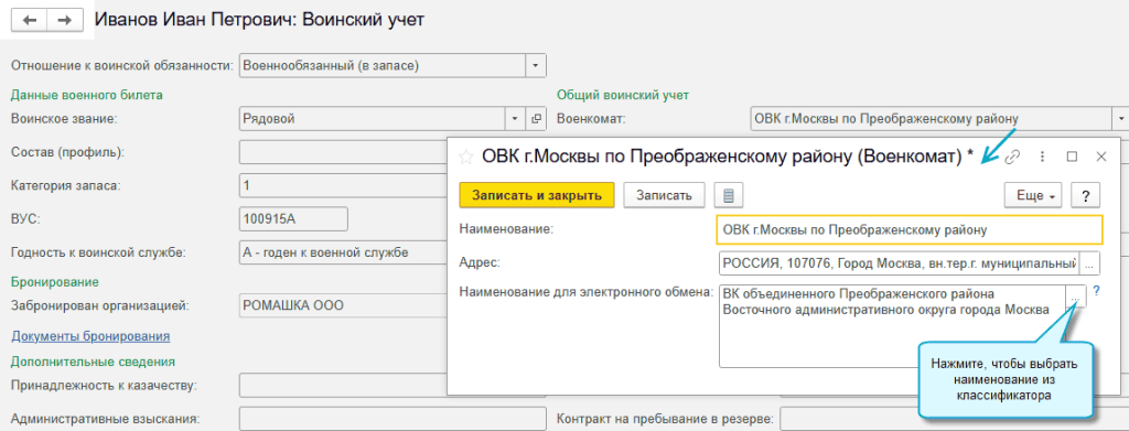 Укажите для военкоматов их наименование для электронного обмена из классификатора.