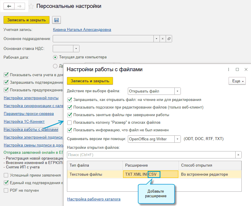 При выгрузке отчетов файлы создаются в формате csv, разделитель значений – точка с запятой, кодировка – UTF-8. Поэтому добавьте расширение CSV в персональные настройки, чтобы в документе по кнопке Открыть файл файл открывался во встроенном редакторе.