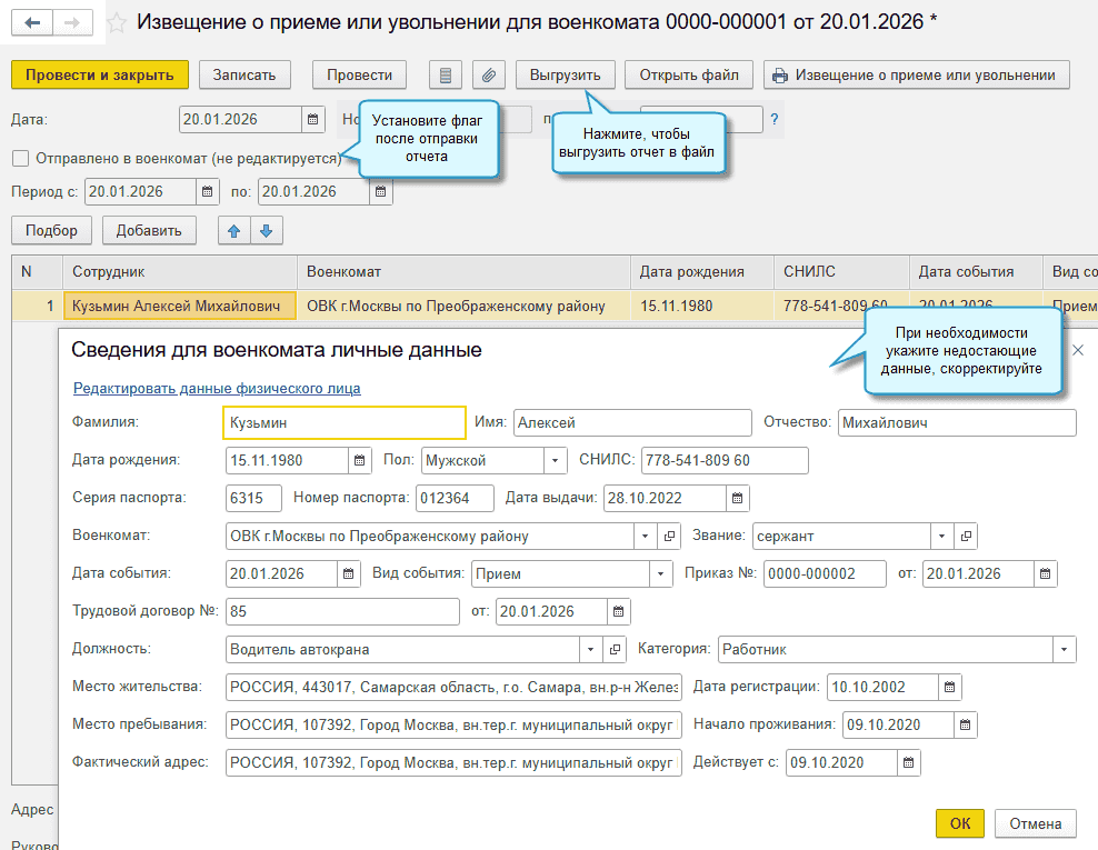 Для подготовки отчетов с выгрузкой добавлены документы в новом журнале Сведения для военкоматов: