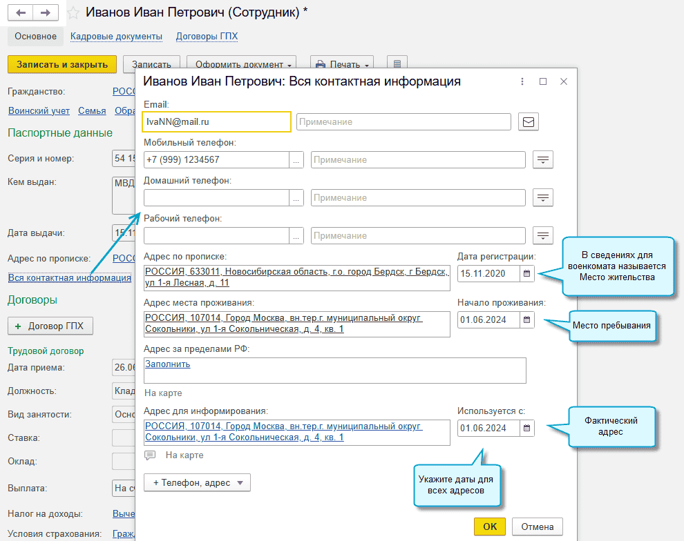 Укажите в карточках сотрудников адреса места проживания и адреса для информирования с датами, если в настройках не установили, что в отчетах заполняется только адрес по прописке.